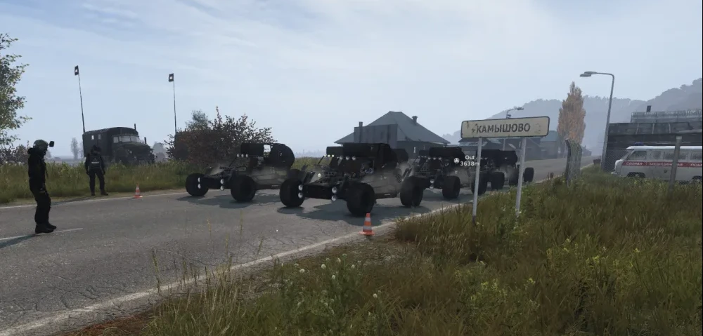 - Патрульные FPV дроны на военные базы. На некоторых военных базах дроны появляются с шансом, на остальных патрулируют постоянно. Если игрок привлек внимание дрона, то дрон начинает скидывать на игрока гранаты. Тип гранат выбирается случайным образом. Гранаты могут быть осколочными, химическими, свето-шумовыми. Скрыться от дрона можно в помещении лежа на полу. После сбития дрона дрон падает на землю и взрывается. На месте взрыва есть вероятность найти батарейку, либо модуль управления дроном. После уничтожения дрона у игрока есть от 10 до 15 минут до возможного появления нового дрона.