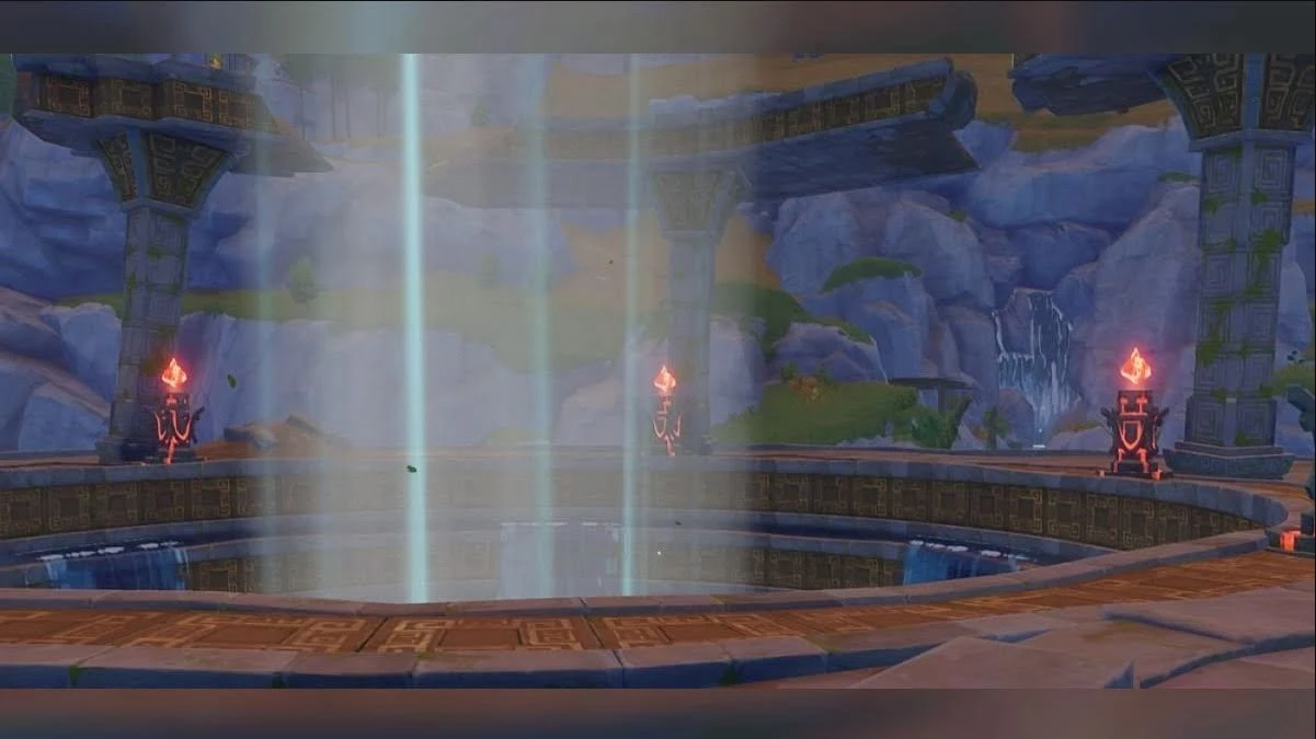 Чтобы попасть в этот дворец, вы должны решить загадку в бассейне Лухуа (Luhua Pool), который расположен на локации Лиюэ (Liyue). При помощи магии огня нужно поджечь три алтаря, которые находятся рядом с самыми высокими столбами. Их местоположение указано на скриншоте.