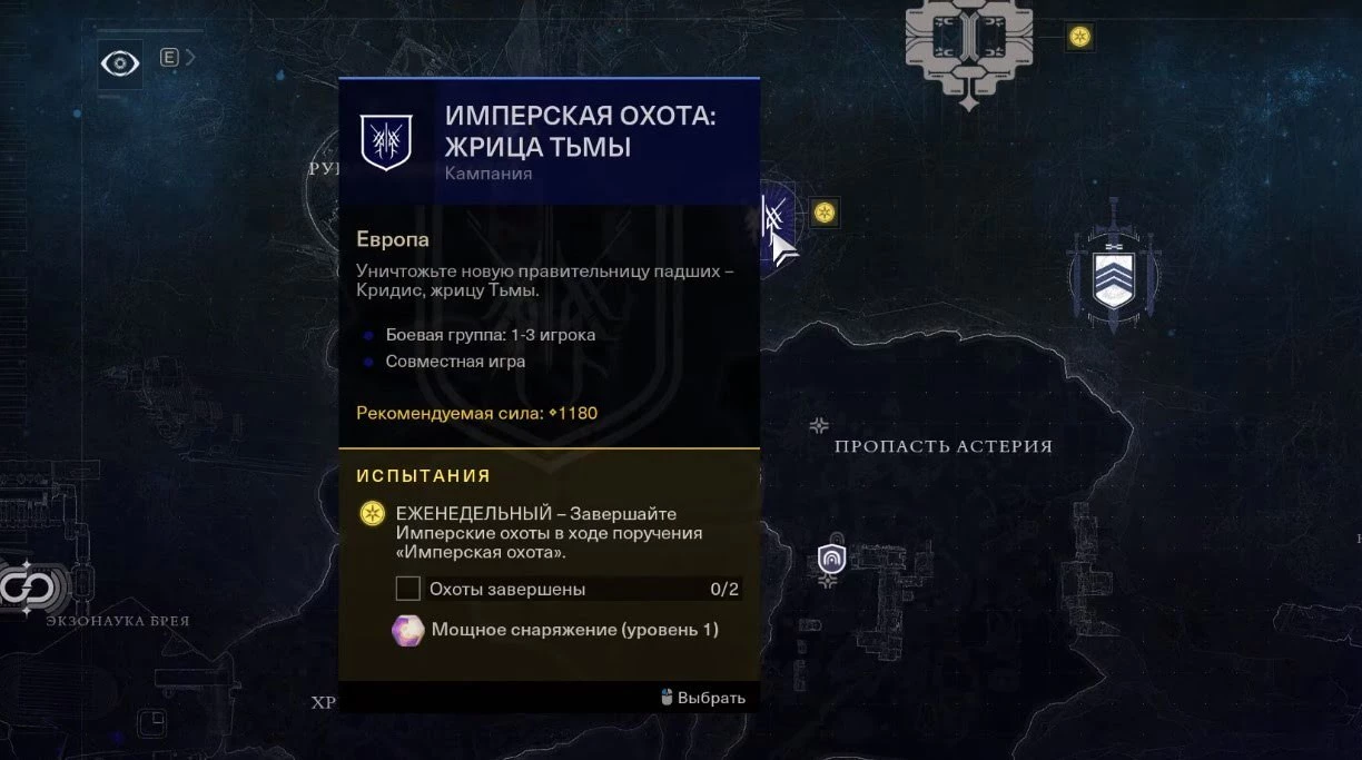 Вам также необходимо будет завершить поручение Экзо-незнакомки под названием «Ливень». Как только эти требования будут выполнены, на вашей карте появится флажок с необходимым квестом. Вы сможете самостоятельно выбрать уровень сложность охоты от «Адепта» до «Мастера».