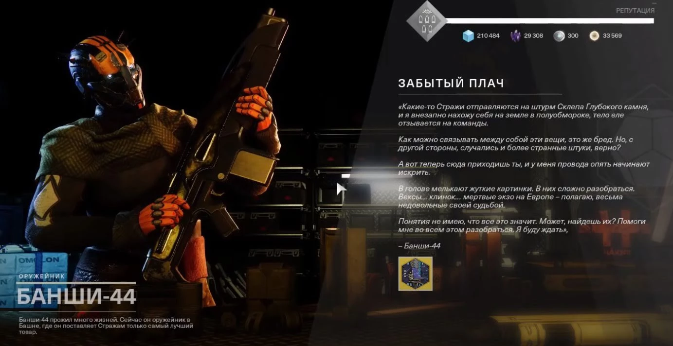 Теперь снова отправляйтесь к Банши-44 и поговорите с ним. Он расскажет вам о новом экзотическом оружии и позволит вам полностью закончить квест.