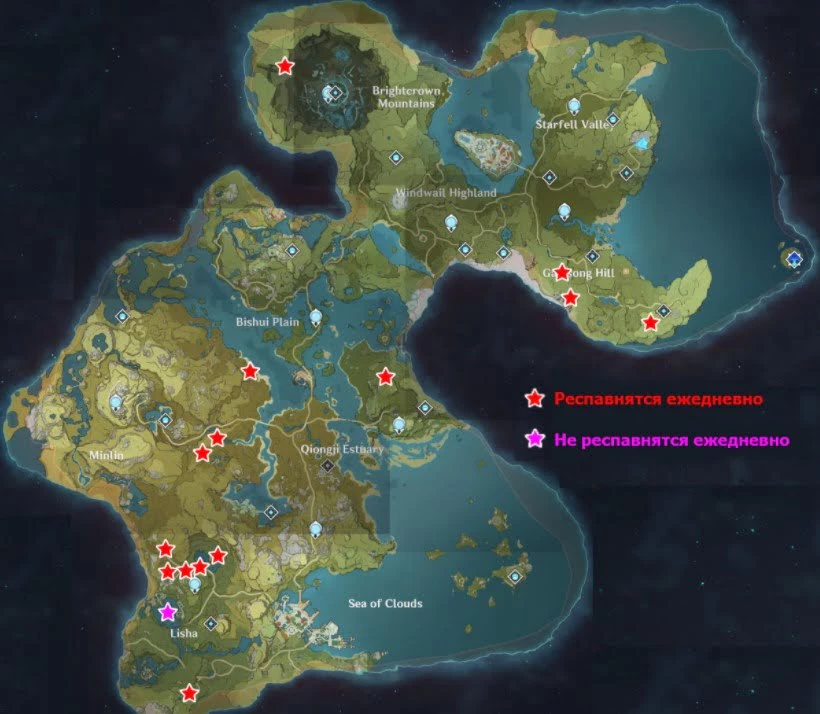 На карте ниже демонстрируются все локации, на которых вы можете столкнуться с данными врагами. Сразу отметим, что они могут оказаться заклинателями разного типа: гео, пиро, электро, анемо, крио или гидро.