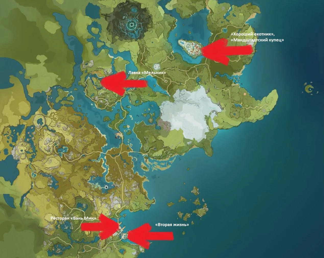 Однако, если Вы не хотите тратить свои деньги на покупку данного блюда, но вместо этого желаете приготовить тофу собственноручно - такая возможность тоже есть! И Вам даже идти далеко не придется, все что нужно сделать - спустится на этаж ниже, все в той же таверне, и найти продуктовый склад. Именно там Вы обнаружите заветный рецепт, однако Вам также потребуются различные ингредиенты для приготовления миндального тофу: Вам понадобится одна банка сахара, три бутылки молока, и одна жменя миндаля. Все эти ингредиенты можно приобрести в различных магазинах, расположение которых показано на скриншоте выше. Миндаль Вы можете приобрести в лавке "мельник", или в магазине "Вторая жизнь", тут же можно купить и молоко, либо же приобрести его в "Мандштадтском купце". А сахар Вы найдете в лавке "Хороший охотник", либо в ресторане "Вань мин".