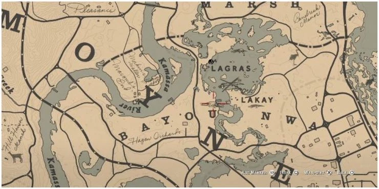 - Первая подсказка находится к западу от изображенного на карте места, недалеко от тропы, обращенной к болоту Лаграс.