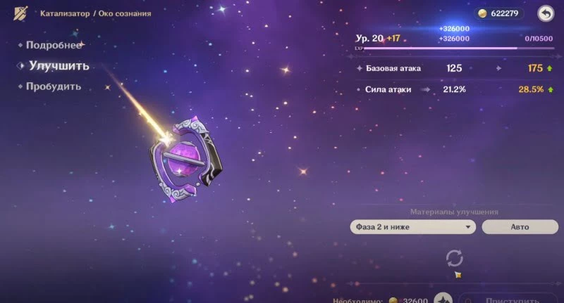 - Око сознания (4-звездочный катализатор) – простые и заряженные удары имеют 50-процентный шанс выпустить стрелу, наносящую урон, равный 360 процентам от силы атаки героя. Эта стрела отскакивает от противников максимум четыре раза. Данный эффект срабатывает один раз каждые 8 секунд.
