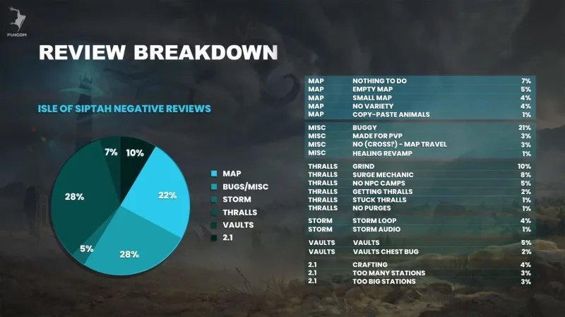 Выпуская Isle of Siptah, мы понимали, что принимаем ряд рискованных решений: мы, как-никак, меняли ключевые особенности Conan Exiles, которые многим из вас полюбились за минувшие 4 года. Одни нововведения большинству игроков пришлись по душе, другие были восприняты прохладно. Ниже представлена схема, в которой мы попытались обобщить самые частые комментарии из отзывов.