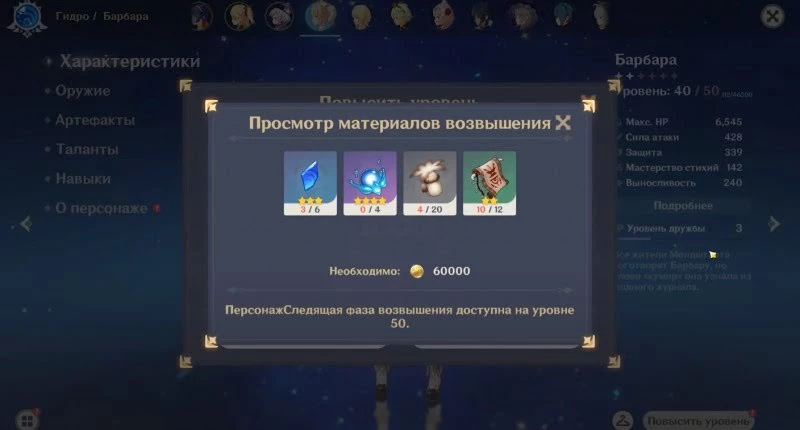 Вам потребуется несколько уникальных предметов для повышения уровня Барбары.