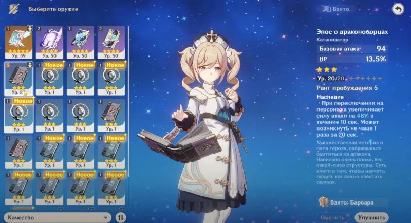 Выбор оружия в конечном итоге зависит от того, как именно вы собираетесь использовать этого персонажа поддержки. Если вы планируете быстренько переключиться на Барбару, скастовать ее заклинания, а затем вернуться к своим DPS (наносят урон), то мы рекомендуем взять Эпос о драконоборцах. Но если вы хотите задержаться на Барбаре подольше, чтобы использовать несколько стихийных взрывов, то возьмите Прототип Малис.