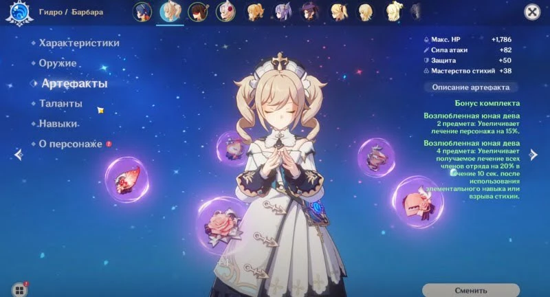 Если вы собираетесь использовать катализатор Прототип злобы, то мы настоятельно рекомендуем экипировать Барбару четырьмя артефактами из набора "Изгнанник" (4-звездочный), с помощью которого вы сможете быстро восстанавливать энергию. При отсутствии полного комплекта можете дополнить его предметами из сета "Ученый" (3-звездочный), увеличивающий скорость восстановления энергии.