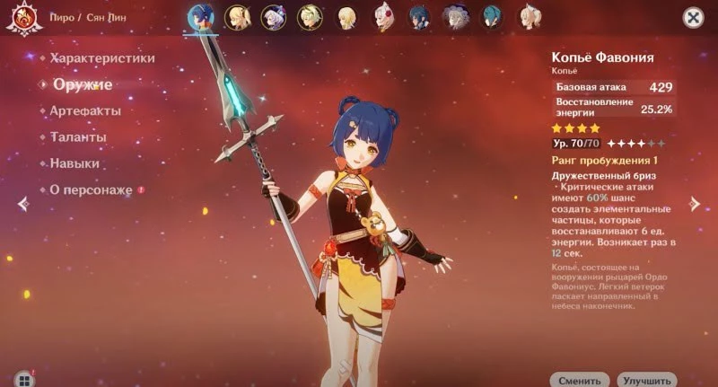 Примечание: Если же вы ищите ультимативное оружие для Сян Лин (подойдет как поддержке, так и дамагеру), то попытайтесь выбить 5-звездочное копье Небесная Ось, улучшающее криты.