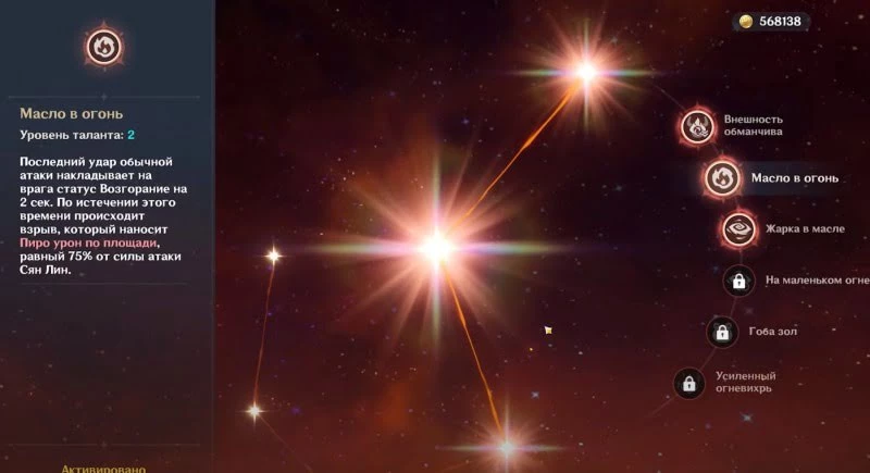 - Уровень 2 – Масло в огонь: последняя атака в последовательности обычных ударов накладывает на противника статус «Возгорание» на 2 секунды. По окончании этого времени произойдет взрыв, который нанесет Пиро урон по площади, равный 75% от силы атаки героини.