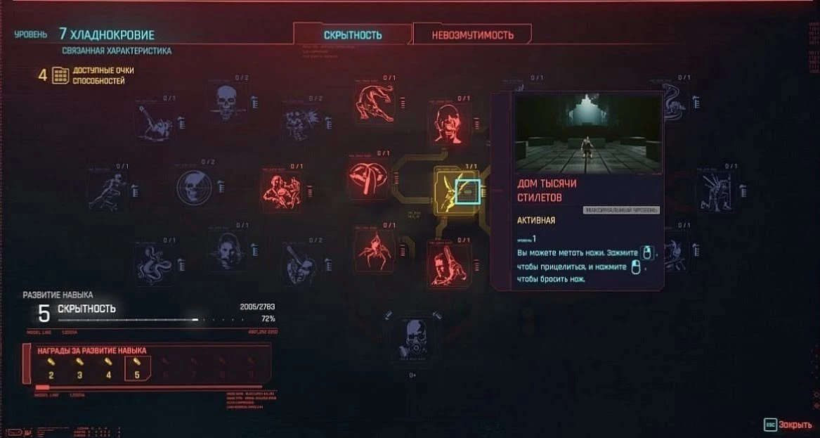 Для того, чтобы открыть возможность метать ножи, Вы должны соответствовать по требованиям к характеристикам, а если быть точнее - к характеристики Хладнокровие, ведь без должного уровня данной характеристики Вы не сможете открывать новые способности в ветке скрытности. Теперь, если у Вас есть свободные очки навыков, Вам необходимо войти в меню, и открыть древо навыков, там нужно выбрать раздел "Хладнокровие" и перейти в ветку скрытности. Именно там находится нужный Вам навык, который называется «Дом тысячи стилетов», открыв который, Вы научитесь метать ножи. Происходит это очень просто, механика привычна, Вам нужно лишь выбрать ножи, зажать правую кнопку мыши, чтобы прицелиться и метнуть снаряд левой кнопкой мыши.