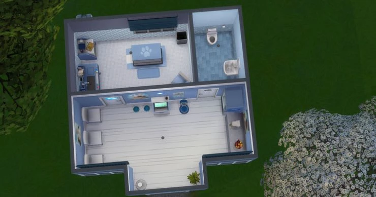 На изображении выше показана моя начальная клиника, которая включает в себя высококачественную версию ветеринарного подиума, стол для осмотра, стол для изготовления лекарств и торговый автомат с лекарствами. Есть отдельный зал ожидания, клиника и ванная комната, а также некоторые дополнительные детали, такие как стулья, кофеварка, миски для еды и декор. Все по-прежнему было меньше 12 тысяч долларов.