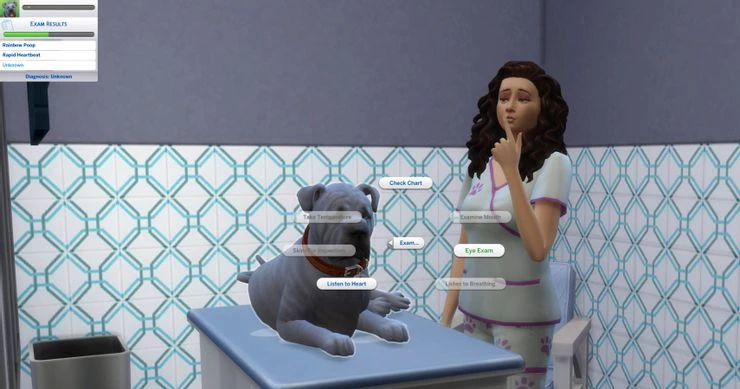 Чтобы лечить животное, сначала дождитесь, пока владелец взаимодействует с ветеринарной трибуной. Как только они это сделают, вы сможете щелкнуть либо сима, либо его питомца, чтобы увидеть опцию «приветствовать пациента». Когда вы их поприветствуете, должно появиться всплывающее окно с сообщением, что питомец плохо себя чувствует. Нажатие галочки в этом всплывающем окне должно запустить процесс проверки. Если вы обнаружите, что обследуемое домашнее животное не попало в вашу очередь, вы можете щелкнуть таблицу обследования и начать процесс вручную. Если что-то выйдет из строя, попробуйте использовать тесты и сбросить настройки своего сима или его питомца.