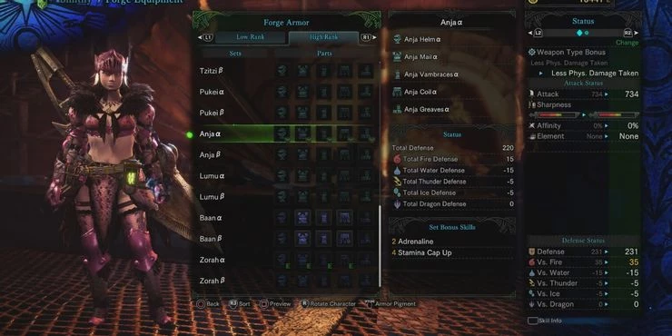 Комплект доспехов Anja Alpha отлично подходит для тех, кто строит дальний бой, например, тех, кто использует тяжелые луки, поскольку у него есть бонус набора для повышения выносливости и адреналина. У него также есть активные навыки, такие как Fire Attack Lv. 3, Огнестойкость Ур. 3, Специальное усиление боеприпасов Ур. 2 и марафонца ур. 1. Большинство предметов можно получить, выследив Анаджанатха, грубую виверну, находящуюся в Древнем лесу и Пустошах Дикого Шпиля.