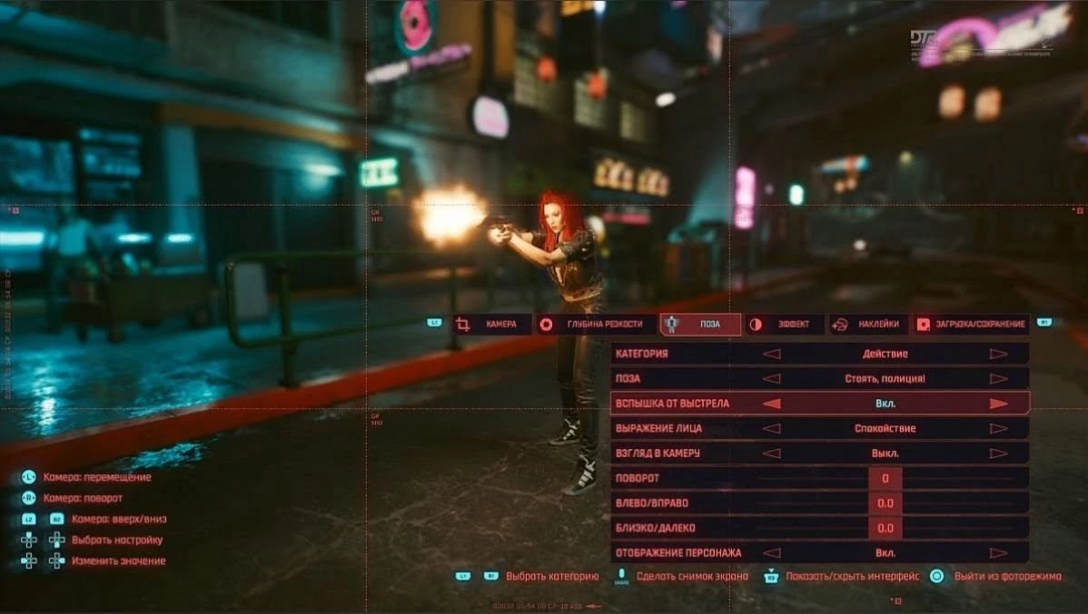 - Поза. Можно настроить не только положение тела Ви, но и выражение лица. Обратите внимание на пункт «Вспышка от выстрела». Благодаря нему создается ощущение, что скриншот снят прямо во время перестрелки. Здесь же можно полностью убрать отображение главного героя. Эта функция будет полезна тем, кто хочет запечатлеть пейзаж.