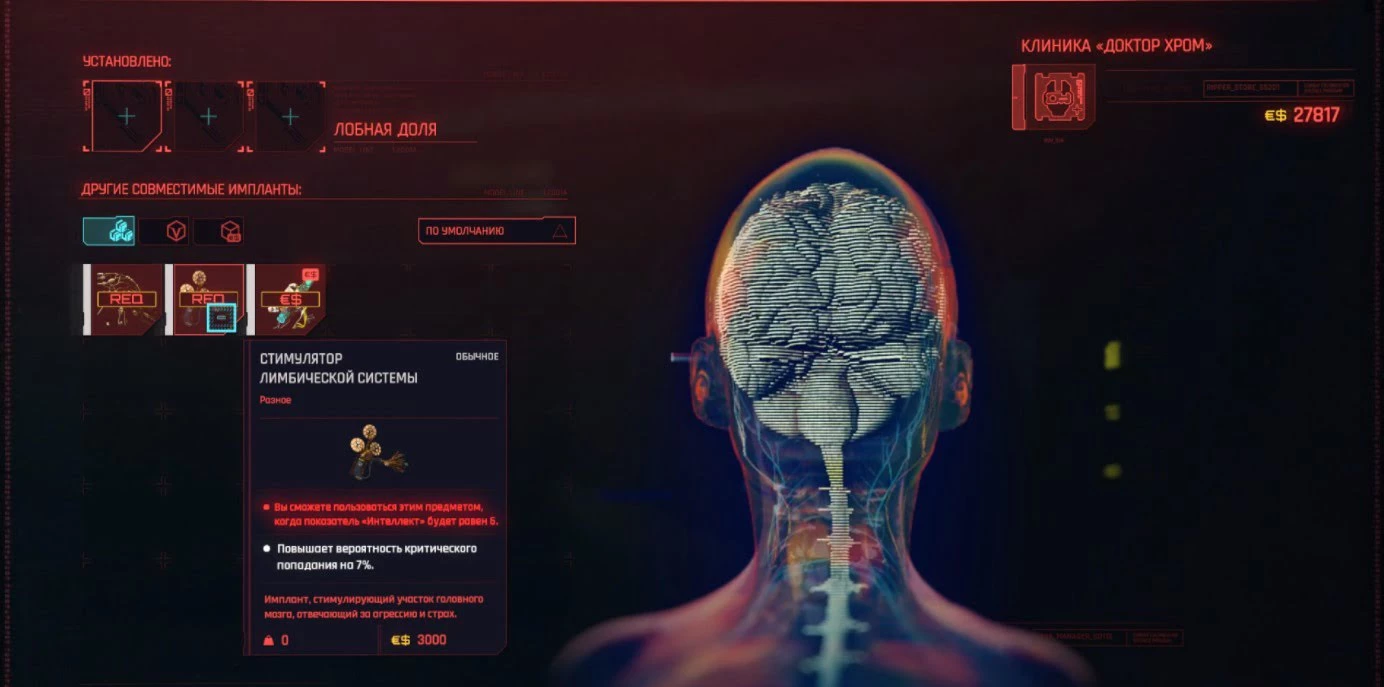 Самая важная часть экипировки — это, конечно, ваша кибердека, которая позволит вам разместить выбранные скрипты. Кроме того, обратите внимание на импланты лобной доли, например, «Стимулятор лимбической системы» (Limbic System Enhancement), который увеличивает ваш шанс критического попадания.