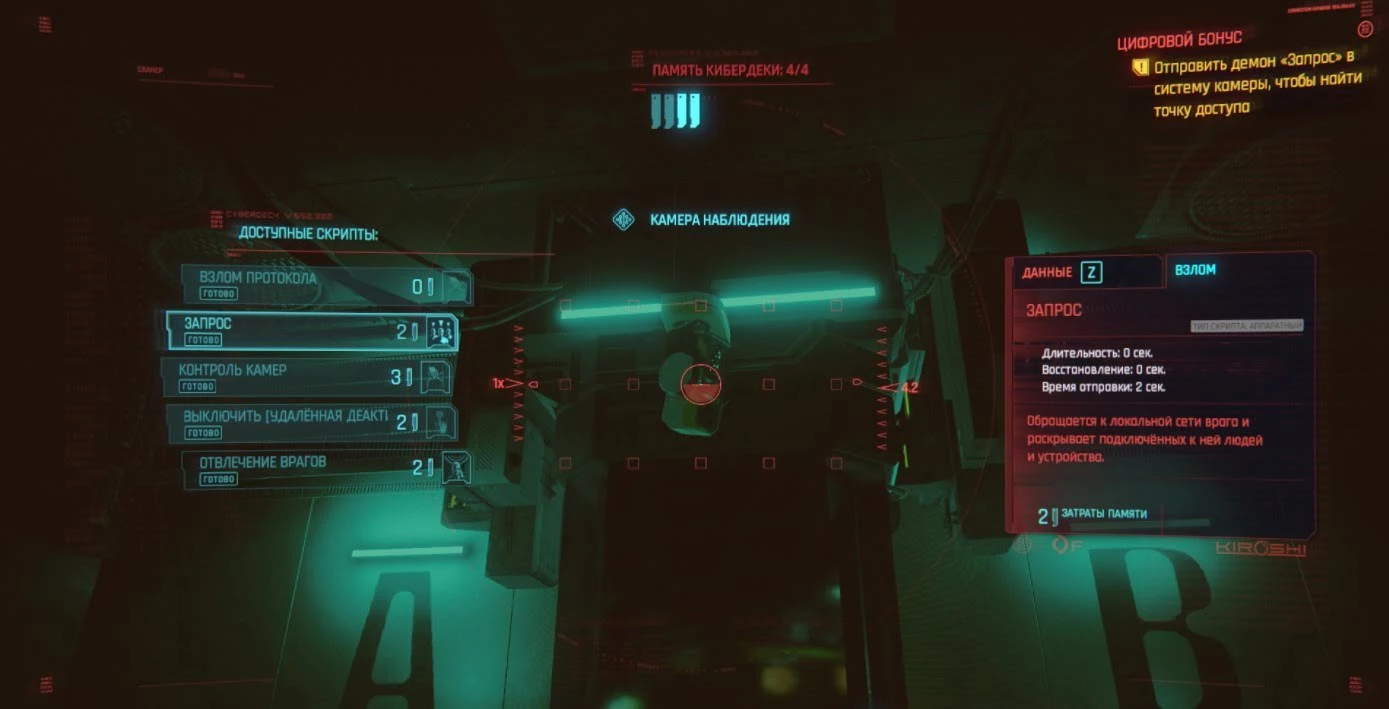 Прежде чем вы решите играть за хакера, обязательно выполните квест «Цифровой бонус» (номер 1 в нашем прохождении). В награду за квест вы получите быстрый хак «Запрос» (Ping). Эта способность — важный инструмент для игроков, которые хотят стать нетраннером. Когда вы используете её на врага или какой-либо технологии, например, камере, она обнаруживает всех врагов и устройства поблизости. Это позволит получить четкое представление о том, что происходит вокруг вас.