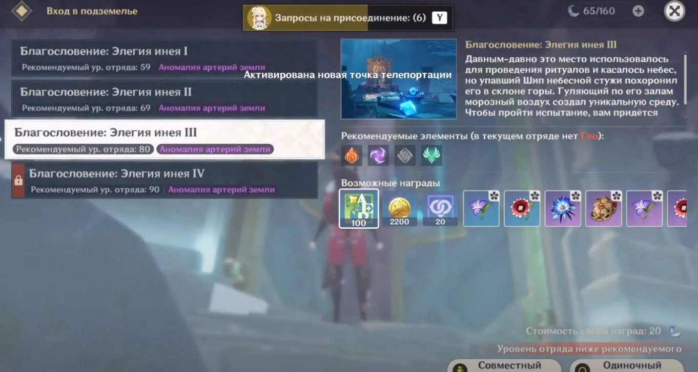 - Благословение: Элегия инея III (рекомендуемый уровень отряда – 80) – 100 очков приключений, 2200 мора, 20 очков дружбы, сет Воля защитника (3-4 звезды), сет Азартный игрок (3-4 звезды), сет Заблудший в метели (4-5 звезды) и сет Сердце глубин (4-5 звезды).