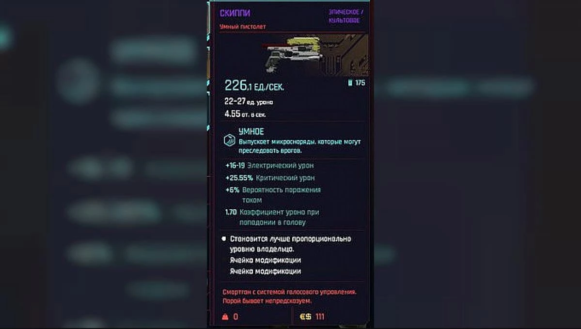 Ну и последний, возможно самый лучший пистолет в игре - "Скиппи", ну или по крайней мере, самый интересный! Ему у нас также посвящен отдельный гайд: "Скиппи в Cyberpunk 2077: Как получить живой и озвученный пистолет?", так что если не читали - можете наверстать упущенное!
