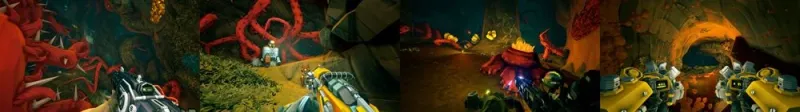 Итак, почему это изменение? Что ж, в нашем прототипе Caustic Mire немного походил на дешевую смесь Кристаллической пещеры и Магматического ядра. И Hollow Bough сразу же выделился в нашем первом прототипе очень оригинальным и интересным. Мы чувствовали, что он выглядел лучше и более отличался от других биомов. Кроме того, у нас просто было больше оригинальных идей для Hollow Bough, и мы действительно хотели изучить технологию сплайнов, которую мы использовали для построения трубопроводов в On-Sight Refining, чтобы сделать жуткие колючие лозы.