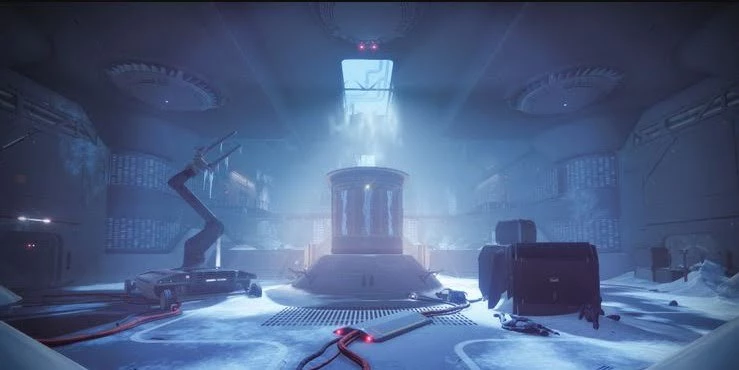 Достигнув ярко-красной комнаты, обозначающей начало Вечности, следуйте по узкому коридору справа от вас, чтобы спуститься на этаж, открывая огромную комнату, заполненную серверными башнями. Еще раз пройдите через дверь в конце этой арены, чтобы следовать еще по линейному пути, пока не дойдете до ледяной комнаты с круглым набором серверов в центре комнаты. Для наглядности комната выглядит так: