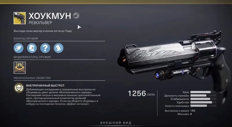 Хоукмун – это по-настоящему уникальная экзотика, поскольку речь идет о единственном оружии, которое можно использовать со случайными перками. Каждая копия оружия, которую вы найдете в дальнейшем, будет иметь случайные характеристики. Это означает, что вы можете получить немного лучшие перки для ствола, магазина или рукоятки, что позволит вам добыть револьвер, который будет идеально соответствовать вашему стилю игры.