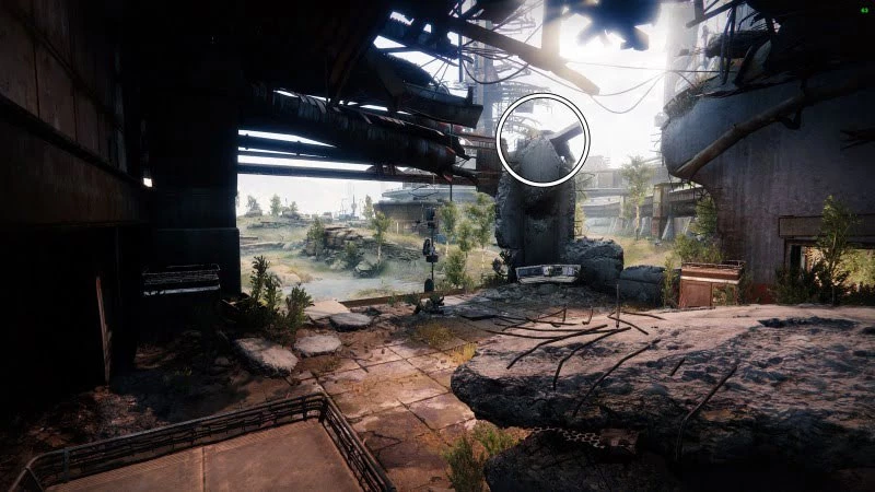 Следующее перо находится в локации Топь на ЕМЗ. Используйте точку быстрого перемещения и двигайтесь вперед к утесу слева. Предмет лежит на выступе разрушенного здания.