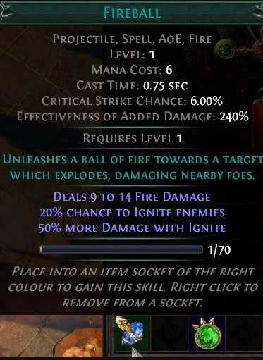 Огненный шар – простое заклинание в большинстве ARPG. Ваш персонаж создает пылающий снаряд, поражающий цели. Теги разбивают это заклинание на основные характеристики, которые могут изменить Камни поддержки. В случае с Fireball у него есть теги Projectile, Spell, AoE и Fire, как видно под его названием. Это означает, что любые камни поддержки, имеющие хотя бы одно из этих четырех свойств, могут воздействовать на Fireball.
