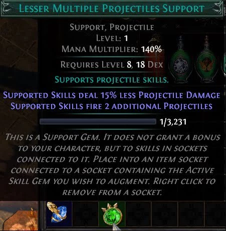 Теги этого камня читаются как Поддержка и Снаряд, что означает, что он может поддерживать любое умение с меткой Снаряда. Так как Fireball имеет Projectile в качестве одного из своих тегов, Lesser Multiple Projectiles будет работать. Теперь ваш Fireball будет выпускать три снаряда при каждом применении вместо одного.
