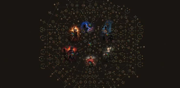Все классы доступны с самого начала, за исключением Наследника, которого нужно спасти в конце Акта 3, прежде чем она станет игровым персонажем. Каждый класс начинается в своем собственном разделе дерева пассивных навыков (показано ниже). Как подразумевается, само пассивное дерево одинаково для всех классов, отсюда его устрашающий размер. Теоретически рейнджер может пройти в верхний правый угол дерева рядом с начальным регионом тамплиеров, хотя на практике это очень неэффективно и обычно не стоит того.
