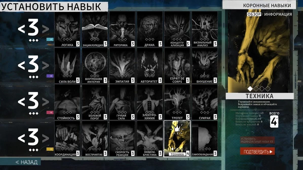 - Техника — необязательный, но крайне интересный навык. Помимо взаимодействия с техническими устройствами, умение всплывает в диалогах, причём в совершенно неочевидных ситуациях.