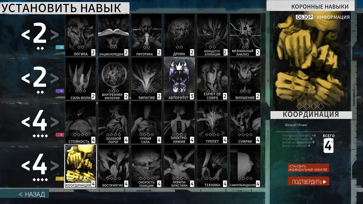- Энциклопедия и восприятие — это лор игры. Они никак не помогут вам в вашем расследовании, но вы сможете узнать много интересной информации про Ревашоль и его обитателей. Прокачивайте на ваше усмотрение.