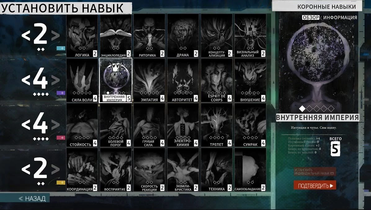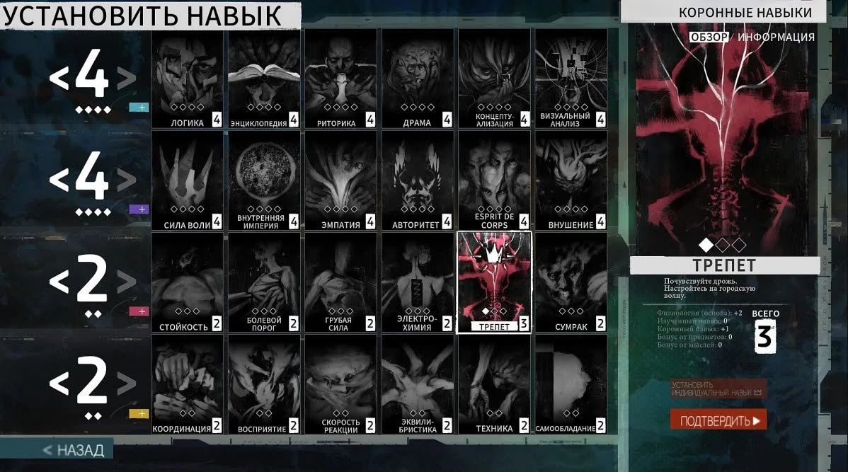 Полезные навыки: внутренняя империя, электрохимия, сумрак, драма, концептуализация, трепет. Остальные навыки по желанию.