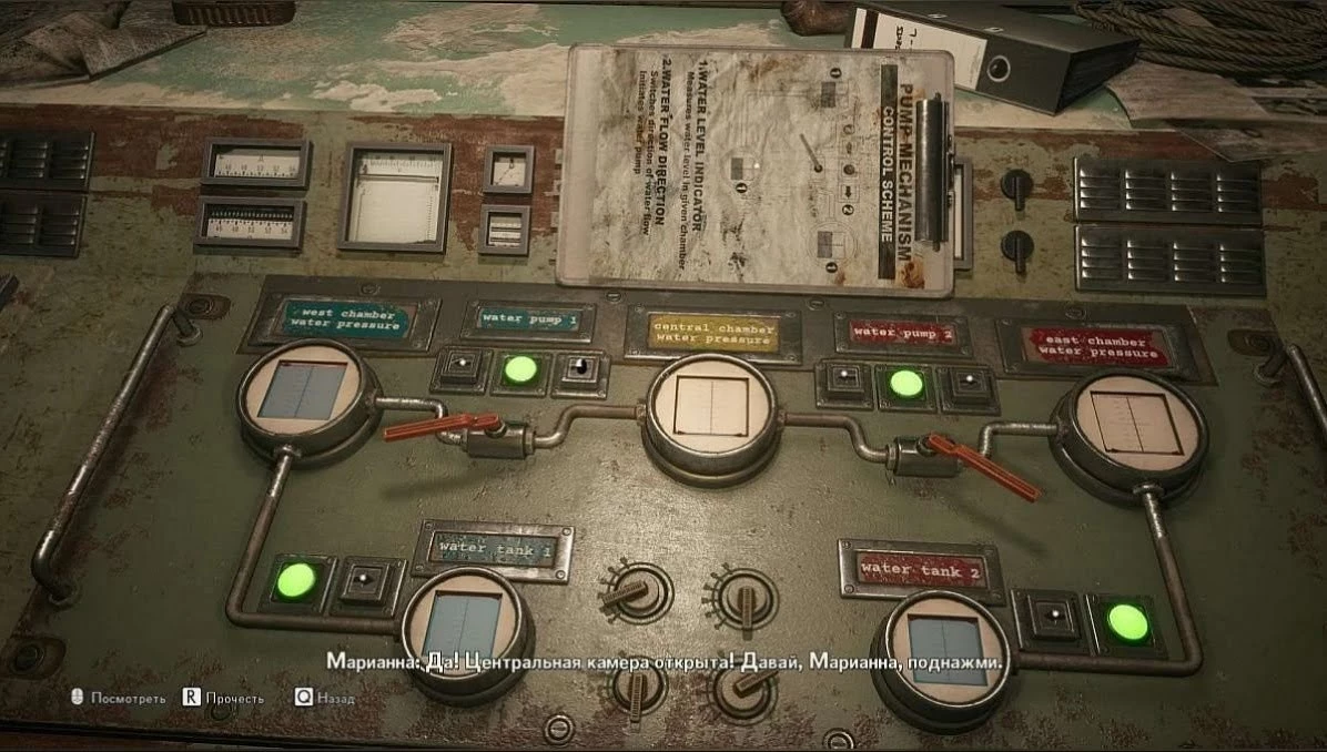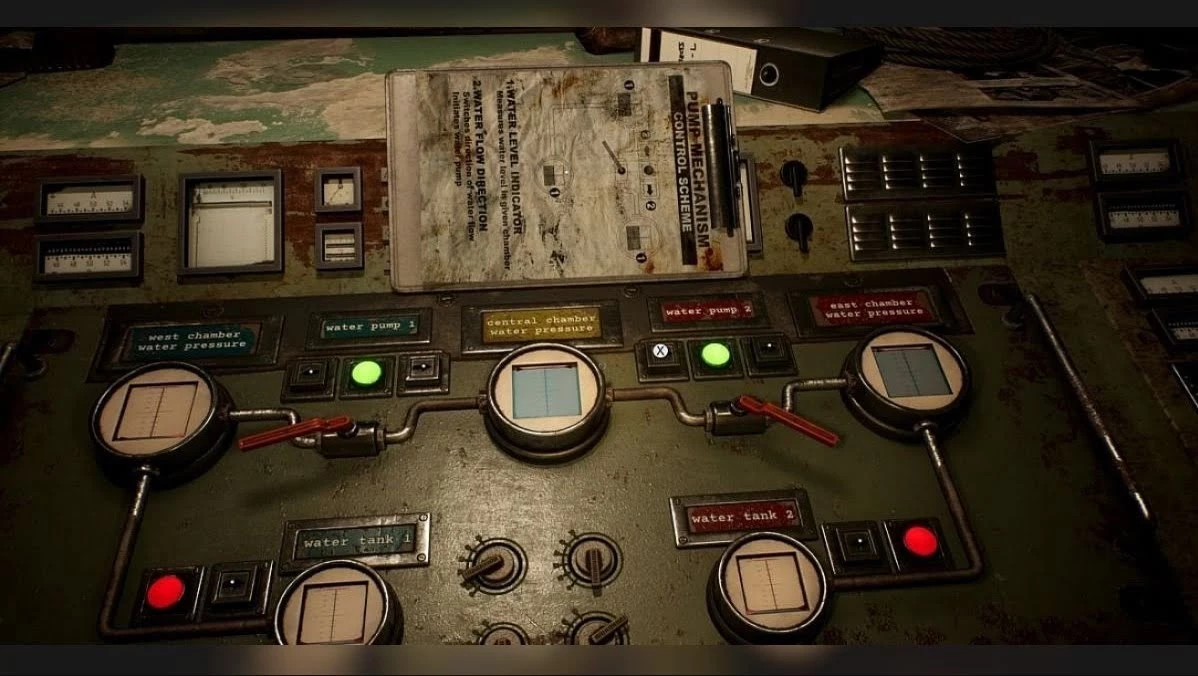 Когда питание на станции будет восстановлено Вам необходимо изучить панель управления в диспетчерской , при помощи которой, Вы сможете управлять водой в резервуарах. Возле каждого индикатора, отображающего статус заполненности бака есть кнопки, которые и направляют потоки воды. Сейчас мы подробно распишем последовательность действий, которые необходимо выполнить, чтобы решить эту головоломку. Для начала, вам необходимо сосредоточится на верхних резервуарах, в то время как нижние должны оставаться открытыми. Нужно закачать всю воду в центральный бак, и в правый верхний бак так, как показано на скриншоте выше. Теперь, отходите от панели управления, и отправляйтесь к лестнице, чтобы спустится вниз, вода теперь Вам не помешает это сделать. Здесь Вам необходимо найти вентиль, и провернуть его, чтобы открыть бак с водой, но для этого необходимо использовать энергетический щит, чтобы защитить Вашего медиума в мире духов. Когда дело будет сделано, отправляйтесь к выключателю, который Вы использовали, чтобы запустить электричество на станции, сейчас Вам необходимо его выключить и вернуться к пульту управления.