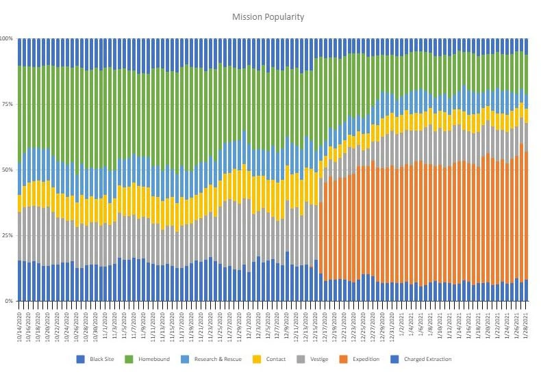 Как упоминалось в предыдущем письме, мы хотели, чтобы режим «Экспедиция» был безопасным местом для одиночных игроков, которые могли бы намочить пальцы ног в сумасшедшем бассейне. И похоже, что это помогает; как вы можете видеть в таблице ниже, в среднем более 63% попыток миссий в режиме экспедиции совершаются одиночными игроками.