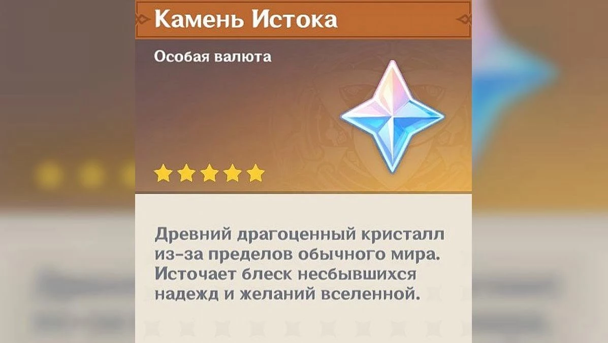 Камень истока — это премиальная валюта, которую можно потратить на пополнение первородной смолы, покупку «Судьбоносных встреч» или «Переплетающихся судеб». На покупку каждой молитвы придется потратить 160 камней истока. Также камень истока расходуется на повышение уровня боевого пропуска (150 камней истока за каждый уровень). Можно получить, выполняя поручения и задания, или открывая сундуки. Можно обменять кристаллы сотворения на камни истока. Можно найти в сундуках, Витой Бездне, на ежемесячной карте и в боевом пропуске.