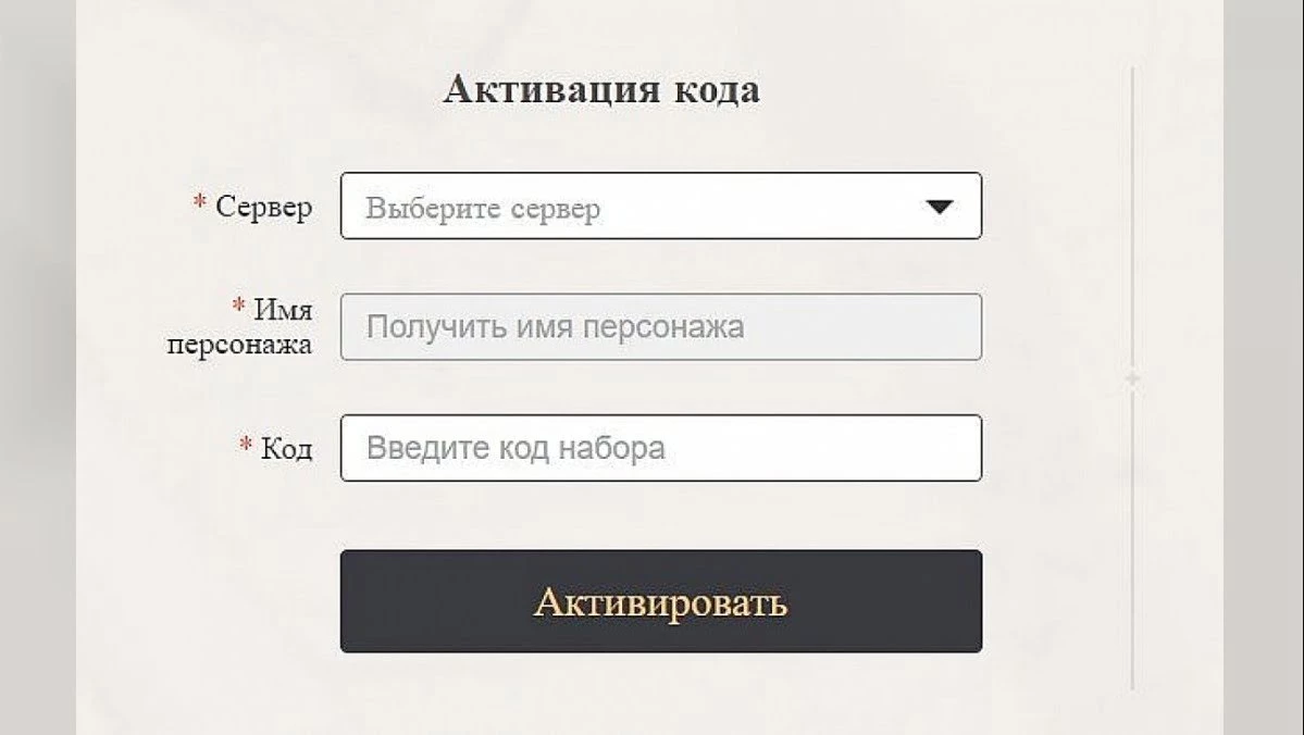 - Заполняем поля для активации кода. Выбираем сервер, вводим имя персонажа и выбранный код;