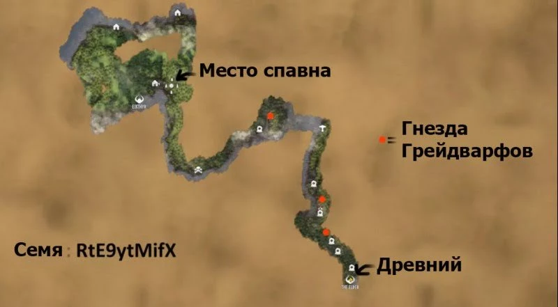 Не можете найти рунический камень или хотите сразу же сразиться с боссом? Используйте семя RtE9ytMifX, чтобы появиться на карте, изображенной на картинке ниже. Как можно увидеть, Древний находится довольно далеко на юге, но вы можете воспользоваться плотом или лодкой, если она у вас есть, чтобы быстрее добраться до врага. Не забывайте использовать силу Эйктюра, если просто бежите – это сэкономит вам время.
