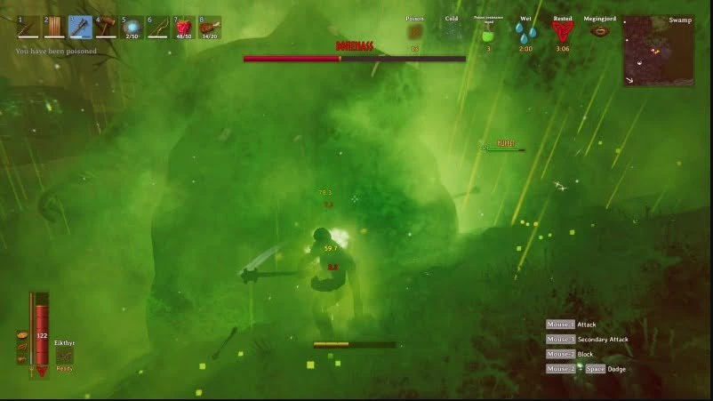 Следует также знать, что данный противник наносит урон ядом и вызывает отравление. Защититься от этих негативных эффектов можно с помощью медовухи, которая значительно повышает сопротивление к яду. Для ее создания требуется котел, мед и бродильная бочка.