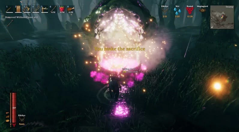 После взаимодействия с рунным камнем вы увидите иконку алтаря, с помощью которого можно вызвать данного противника. Однако для этого вы должны будете сначала принести определенную жертву. На этот раз вам необходимо собрать 10 иссохших костей.
