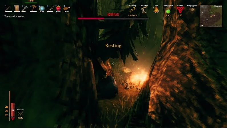 Если вы получили слишком много урона, то отступите и найдите безопасное место для лечения. Можете, к примеру, развести костер возле больших деревьев, которые невозможно срубить. На скриншоте выше показан пример подобного укромного уголка. Там вы сможете отдохнуть, а потом снова ринуться в бой.
