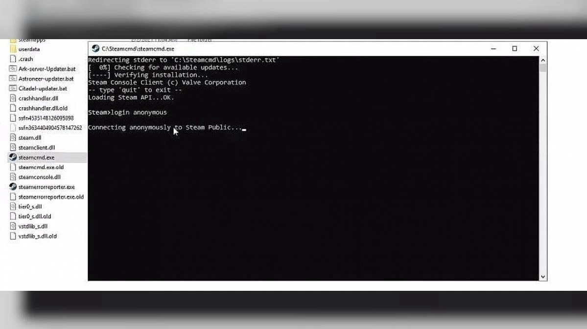 Открываем steamcmd.exe. В появившемся окне, после «Steam>» прописываем login anonymous и нажимаем Enter.