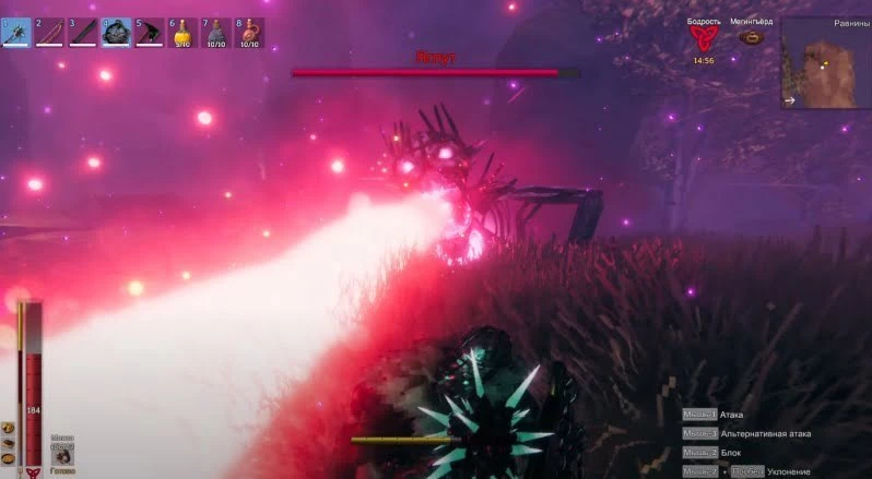 Яглут бьет сильно, ОЧЕНЬ сильно. Но, к счастью, он двигается довольно медленно и имеет несколько легко распознаваемых атак. Однако не следует думать, что вы находитесь в безопасности, отбежав от босса на некоторое расстояние, поскольку его удары могут достать вас даже там.