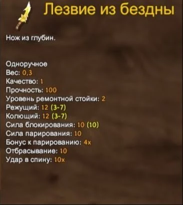 Самый опасный кинжал из всех, так как наносит высокий урон и имеет большую скорость атаки. Не стоит также забывать о 10-кратном бонусе к повреждениям при ударе в спину. Подобный урон способны выдержать очень немногие персонажи и монстры.