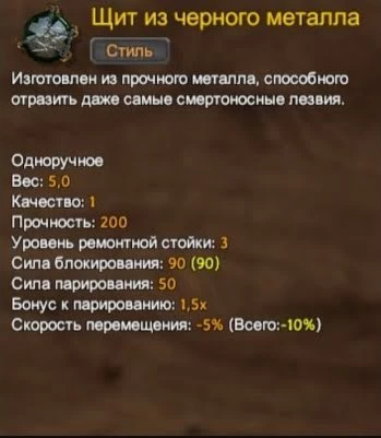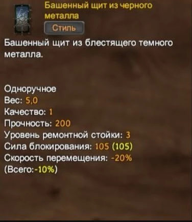 Если вы не хотите слишком сильно снижать скорость передвижения своего героя, то советуем вам использовать данный щит. Он обладает неплохими показателями блокирования и парирования. Обязательно возьмите его при использовании одноручных мечей, топоров или булав.