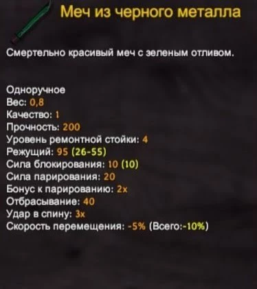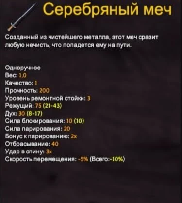 Если полностью прокачать его, то он окажется лучшим мечом в игре. Однако скрафтить его будет непросто, так как для этого требуется черный металл и кузница 4-го уровня. Поэтому большую часть игры вы, скорее всего, проходите с серебряным мечом.