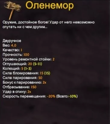 Отличный вариант для начальной игры. Вы сможете заполучить его чертеж после сражения с первым боссом Эйктюром. Он станет вашей первой кувалдой, которая хоть и медленная, но наносит огромный урон по площади. Обязательно возьмите с собой Оленемор при исследовании шахт и подземелий.