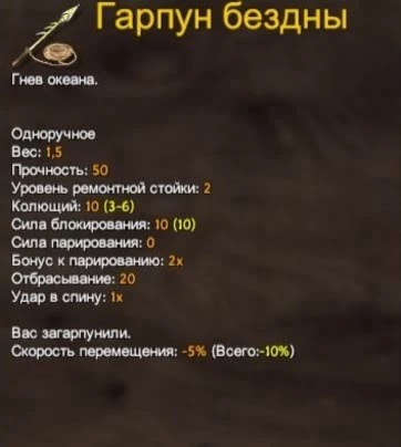 Это не столько оружие, сколько инструмент для захвата или ограничения мобильности врагов. Бросьте гарпун в противника, как обычное копье, и при попадании вы сможете привязать его к себе. Его можно также использовать для приручения животных. Это, безусловно, лучшее средство против Морских змей.