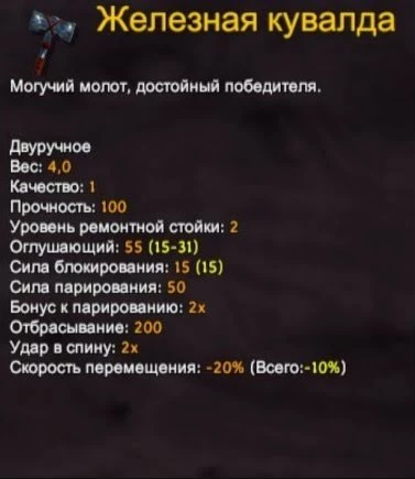 Отличное двуручное оружие, обладающее значительной силой парирования и почти таким же уроном, что и у предыдущего топора. При этом вы сможете разблокировать его гораздо раньше, чем снаряжение из черного металла.