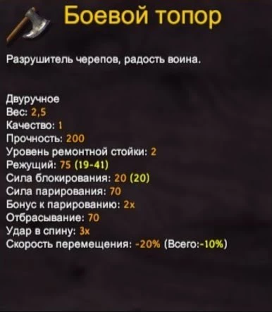 Является лучшим среди одноручных топоров, так как наносит большой урон и при этом обладает немалой скоростью атаки. К тому же его можно использовать со щитом. Однако опять же скрафтить его будет непросто, так как вам потребуется черный металл и высокоуровневая кузница.
